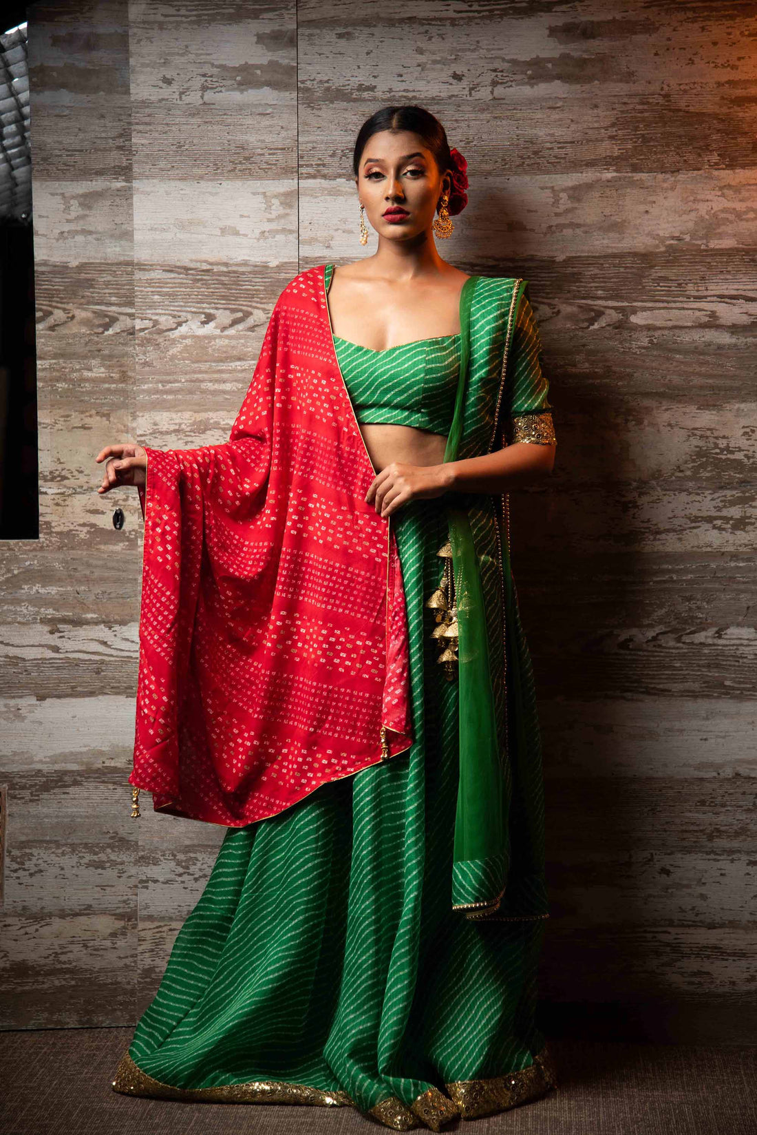 A LA MODE HERITAGE'S EMERALD FLAT LEHENGA WITH BLOUSE LEHERIYA RED & NET DUPATTA