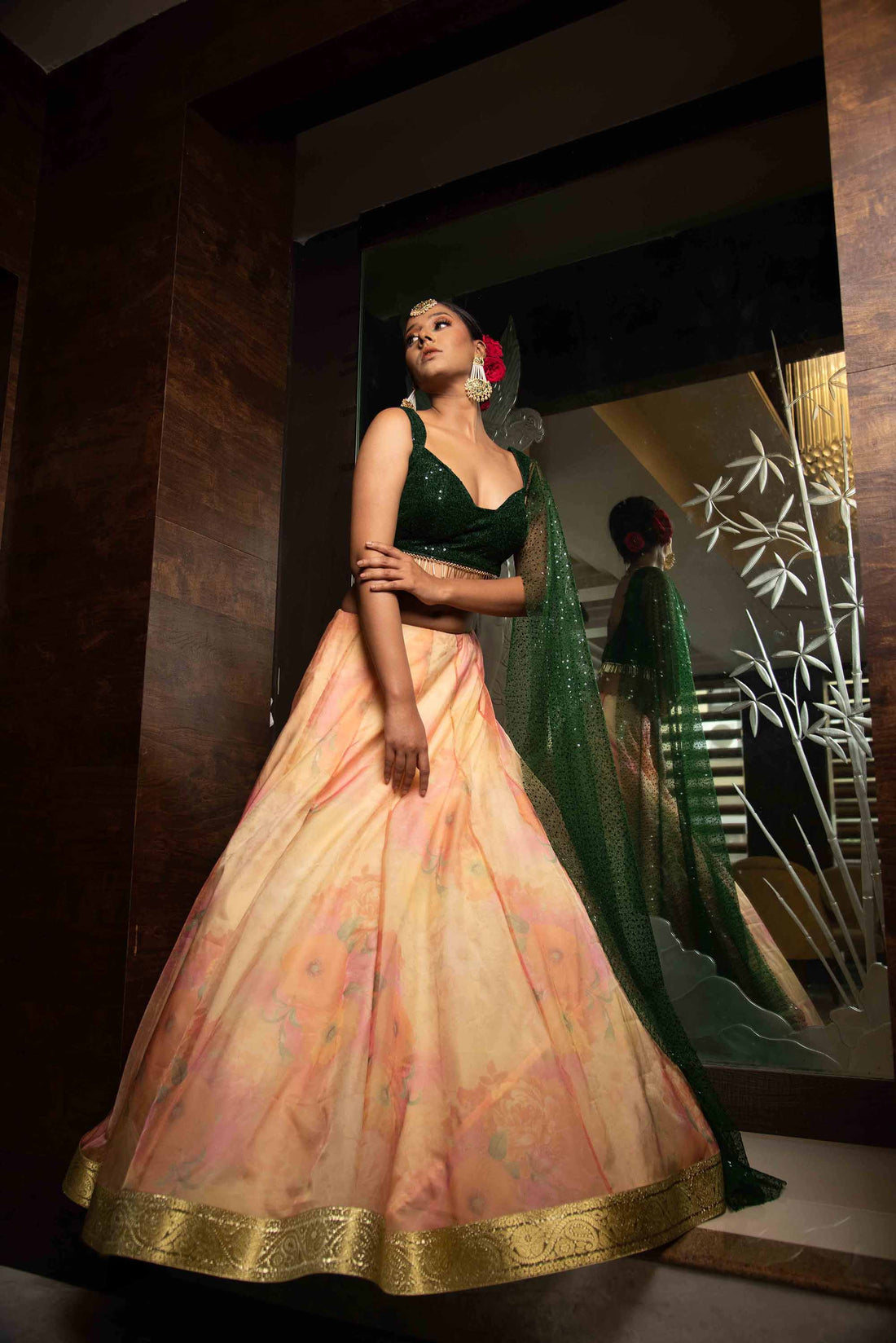ABOUT THE ENSEMBLE : A La Mode Collection presents the Peachy and Green Wave Lehenga....