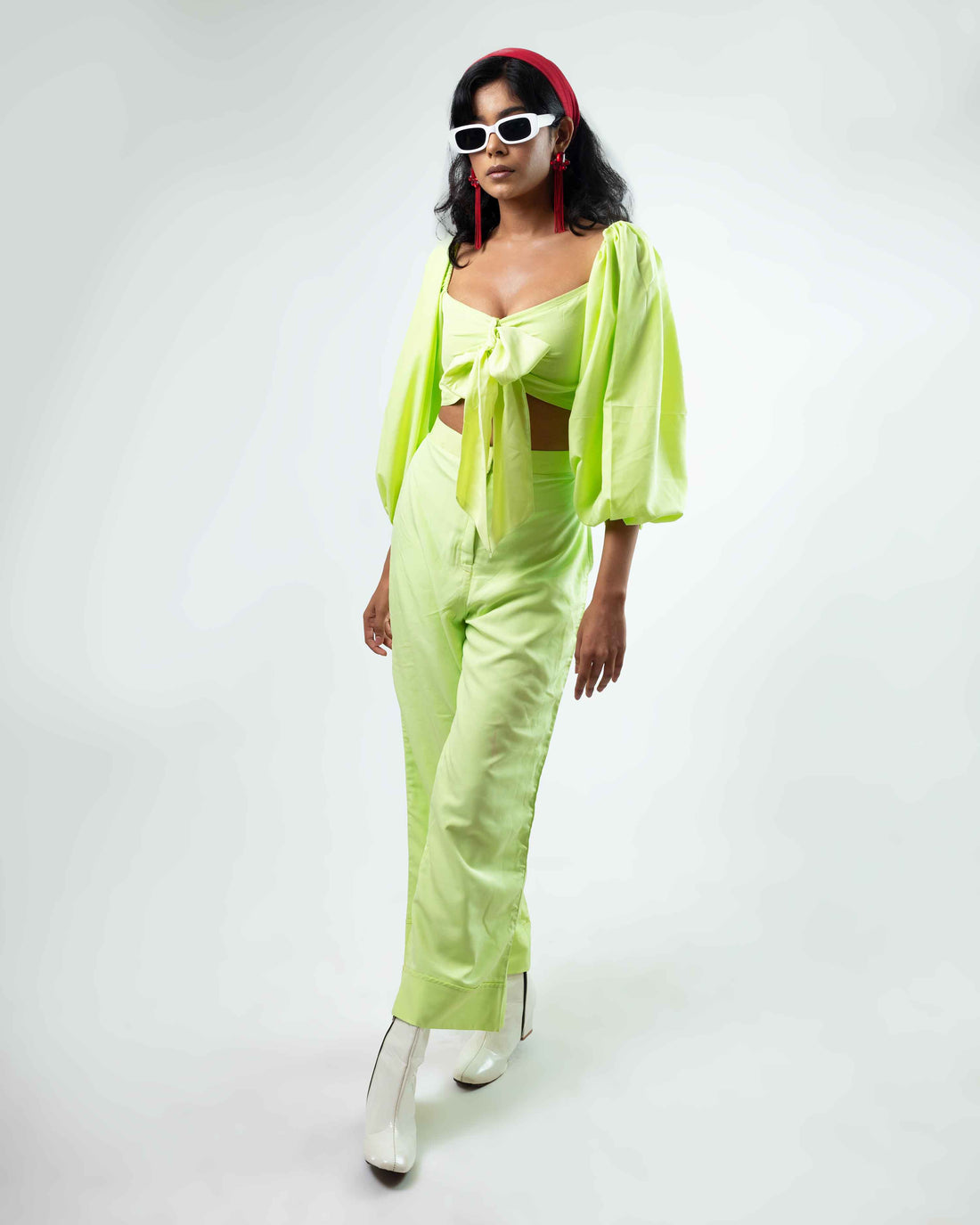 ABOUT THE ENSEMBLE : Slip into our "Dreamy Mint Balloon Sleeves Front Tie Knot Crop...