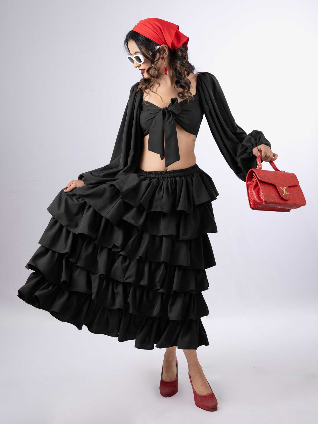 ABOUT THE ENSEMBLE : Slip into our "Dreamy Ruffled Tiered Jet Black skirt" and "Jet...