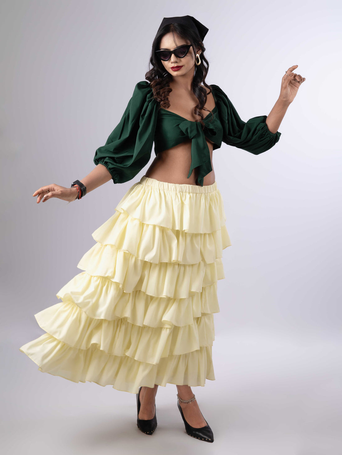 ABOUT THE ENSEMBLE : Slip into our "Dreamy Ruffled Tiered Lemony Skirt" and "Emerald Front...