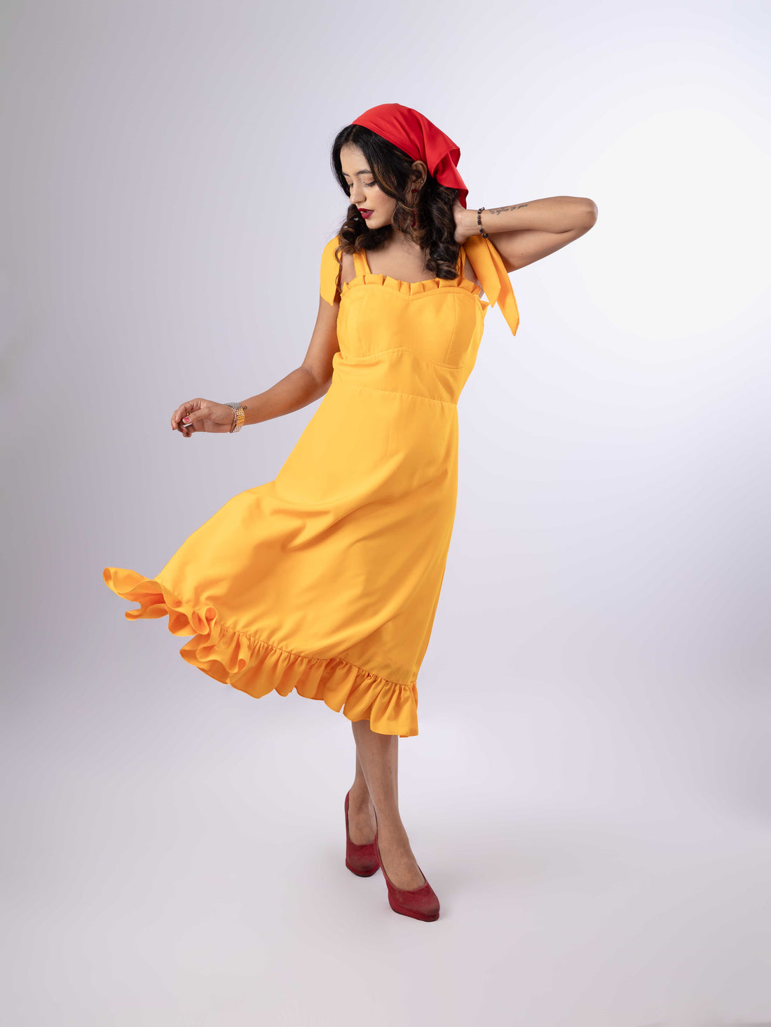 DREAMY RUFFLED TIERED LEMONY SKIRT & EMERALD TIE KNOT TOP