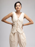SIZE: MODEL IS WEARING STANDARD SIZE 6 (TAILORED WAISTCOAT) , STANDARD SIZE 10 ( OVERSIZED SHIRT) & STANDARD SIZE 6 (BERMUDA SHORTS)
