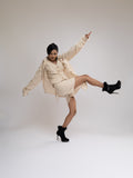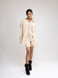 This coordinated look of an oversized shirt, tailored waistcoat, and Bermuda shorts all presents a harmonious blend of relaxed sophistication. The oversized shirt, with its loose and airy silhouette, exudes casual charm while maintaining a sense of elegance with the lightweight material. Paired with a tailored waistcoat meticulously crafted from the same fabric, the ensemble gains a touch of refinement and structure, adding a polished edge to the relaxed vibe. Completing the look, Bermuda shorts offer comfort and versatility, perfect for warmer weather. Whether for a leisurely day out or a casual gathering, this coordinated ensemble effortlessly combines comfort and style, showcasing the timeless appeal in modern fashion.