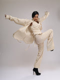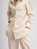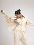 This coordinated look of an oversized shirt, tailored waistcoat, and pyjama trousers all are the epitome of versatile elegance. The oversized shirt, with its relaxed fit and lightweight , offers a casual yet chic vibe, perfect for effortless styling. Paired with a tailored waistcoat meticulously designed , the ensemble takes on a sophisticated edge, adding a touch of refinement to the look. Completing the ensemble, the pyjama trousers crafted from the same airy fabric bring comfort and ease, blurring the lines between loungewear and fashion-forward attire. Whether worn together for a laid-back yet polished look or mixed and matched for endless styling possibilities, this coordinated ensemble showcases the timeless appeal and versatility in modern fashion.