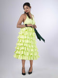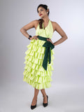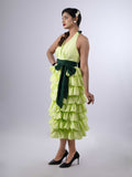 If you are looking for a mod dress for your next outing , look no further. To make you look alluring , this dress features layers of ruffles and exaggerated bow tie knot on neck and on waist in emerald green to popout your waist & has a charming halter neck.
