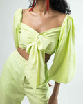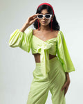 Slip into our "Dreamy Mint Balloon Sleeves Front Tie Knot Crop Top" & "High - Waisted Box Pants" for that mod look. Our Dreamy Co-ord set is a fun and stylish addition to