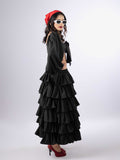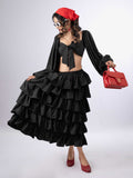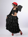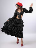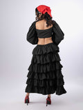 DREAMY RUFFLED TIERED JET BLACK SKIRT & JET BLACK FRONT TIE KNOT CROP TOP