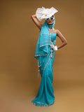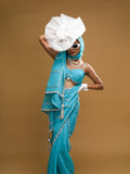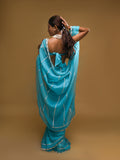 - ENSEMBLE STYLING TIP : For a beach or pool wedding, opt for a breezy draping style. Instead of tightly pleating the pallu, let it flow loosely over one shoulder, creating an effortless, cascading look. You can even drape it in a lehenga style, where the saree is wrapped around like a skirt and the pallu flows freely, allowing for ease of movement and comfort. Choose our aqua mermaid drape corset in the same aqua tone for added drama . Silver or pearl jewelry works beautifully—choose a dainty layered necklace or a choker, along with subtle earrings. You could also wear shell-inspired accessories or anklets for a more coastal vibe. By embracing soft, flowy elements with delicate modern touches, you can transform your aqua saree into the perfect statement piece for a beach or poolside wedding, radiating both elegance and relaxed sophistication.