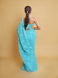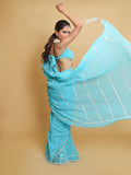 Rani's aqua saree with delicate silver work exudes a refreshing elegance, perfect for both day and evening occasions. The soothing aqua hue brings a serene, graceful vibe, while the intricate silver embellishments add a touch of sophistication and sparkle. The delicate craftsmanship, in the form sequins and zari, creates a subtle yet luxurious appeal, making the saree ideal for festive events or celebrations.