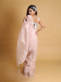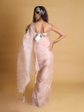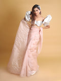 The soft blush pink hue enhances the saree’s romantic charm, creating a subtle yet captivating look. The natural sheen of the fabric adds a soft glow, while the fabric’s structured drape gives a modern, voluminous silhouette. Adorned with fine silver zari work, this saree exudes sophistication and timeless beauty, making it a standout choice for those who love understated glamour with a hint of opulence.