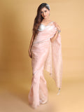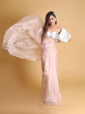 - ENSEMBLE STYLING TIP : Opt for our silver mermaid drape corset that enhances the lightness of the saree to keep the look trendy yet elegant. You can opt or opt out the detachable balloon sleeves . Since a brunch is typically a daytime event, keep your jewelry light and delicate. A pair of elegant pearl or diamond studs with a thin bracelet or bangle works beautifully. For your hairstyle, loose waves or soft curls will complement the feminine flow of the tissue saree. By focusing on soft, light elements and adding modern accessories, your blush pink tissue saree will look stunning and perfectly suited for a stylish, laid-back brunch event.