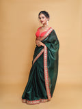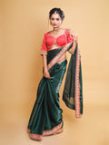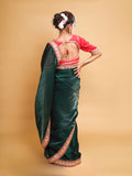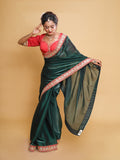 - ENSEMBLE STYLING TIP : Opt for our blood red silk coti corset that complements the richness of the emerald green saree. For a traditional look, layer a statement gold necklace with matching earrings, bangles, or a maang tikka. If you prefer a modern aesthetic, diamond or polki jewelry adds sophistication without overwhelming the ensemble. For a bolder, trend-forward style, go for emerald or ruby-studded jewelry that complements the saree’s rich color. Experiment with draping styles to modernize your look. A pleated pallu draped over the shoulder can add structure, while a free-flowing pallu creates a graceful, ethereal feel. By blending traditional elements with modern twists, your this saree will make a striking statement, exuding elegance and sophistication.