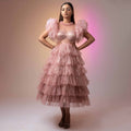 modish ruffle tiered midi . Featuring attractive self-sequence , ruffled
