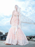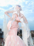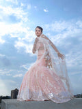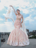 THE ENCHANTING PEACHY MERMAID LEHENGA WITH CORSET AND NET DUPATTA